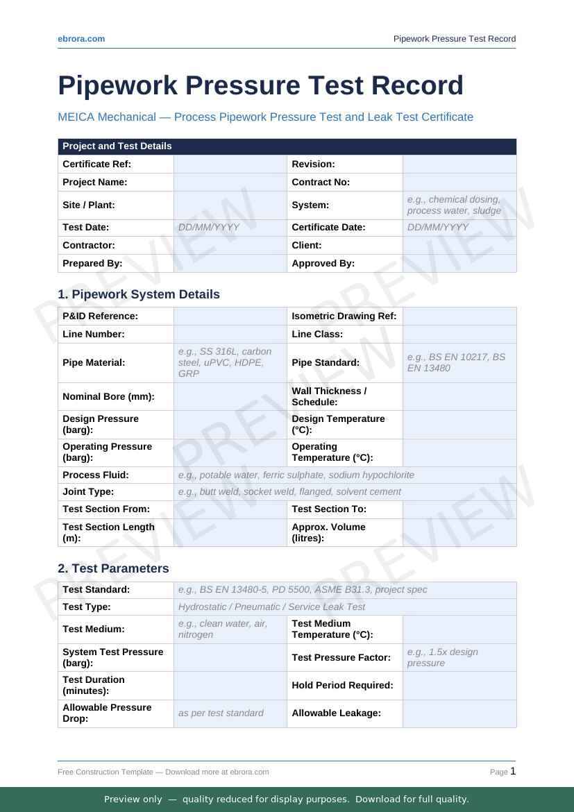 Free Word template: Pipework Pressure Test Record. Download for UK construction sites.
