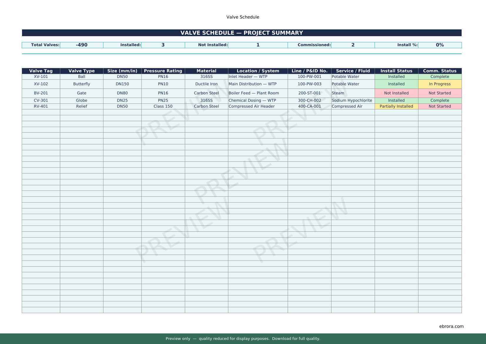 Free Excel template: Valve Schedule and Status Register. Download for UK construction sites.