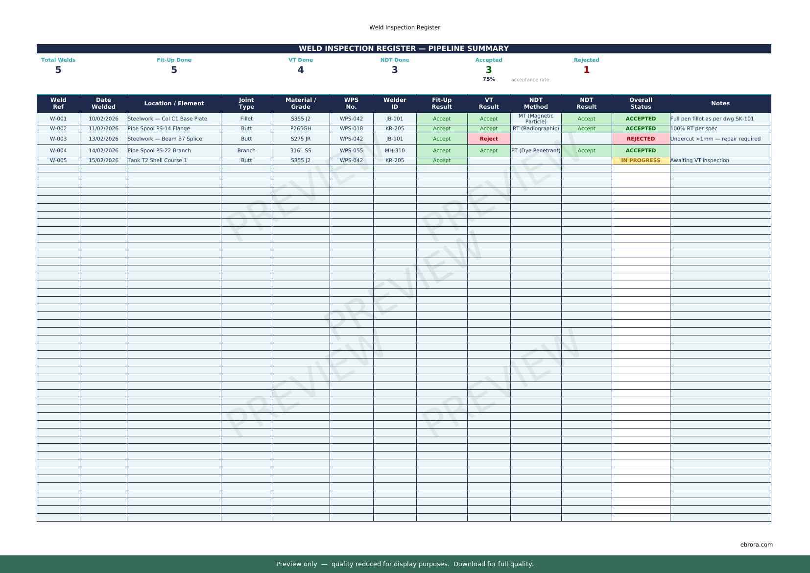 Free Excel template: Weld Inspection Register. Download for UK construction sites.