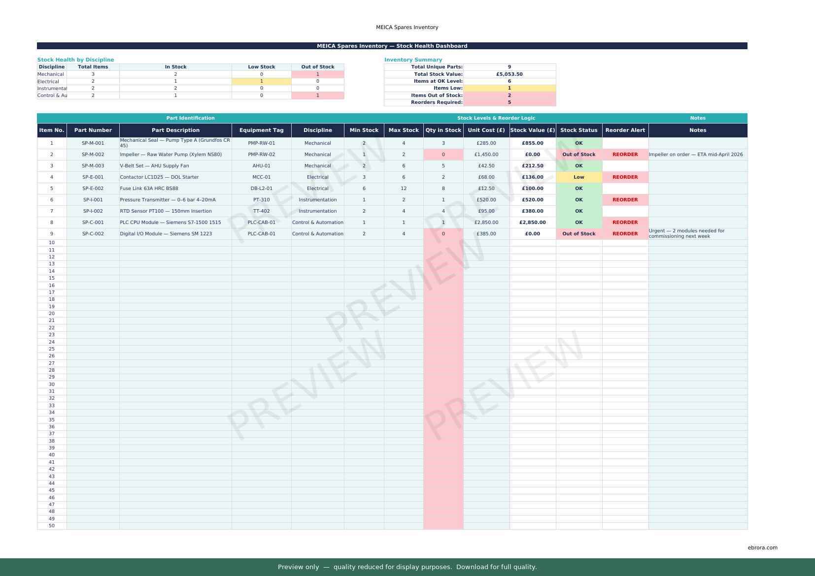 Free Excel template: Meica Spares Inventory. Download for UK construction sites.