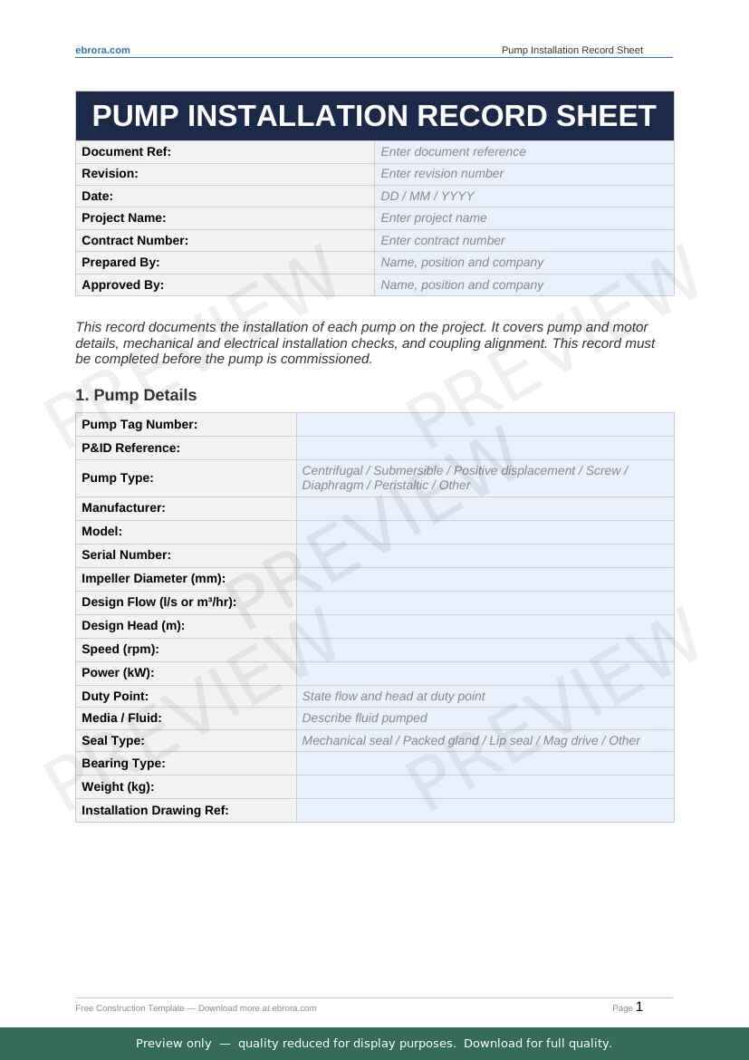 Free Word template: Pump Installation Record Sheet. Download for UK construction sites.