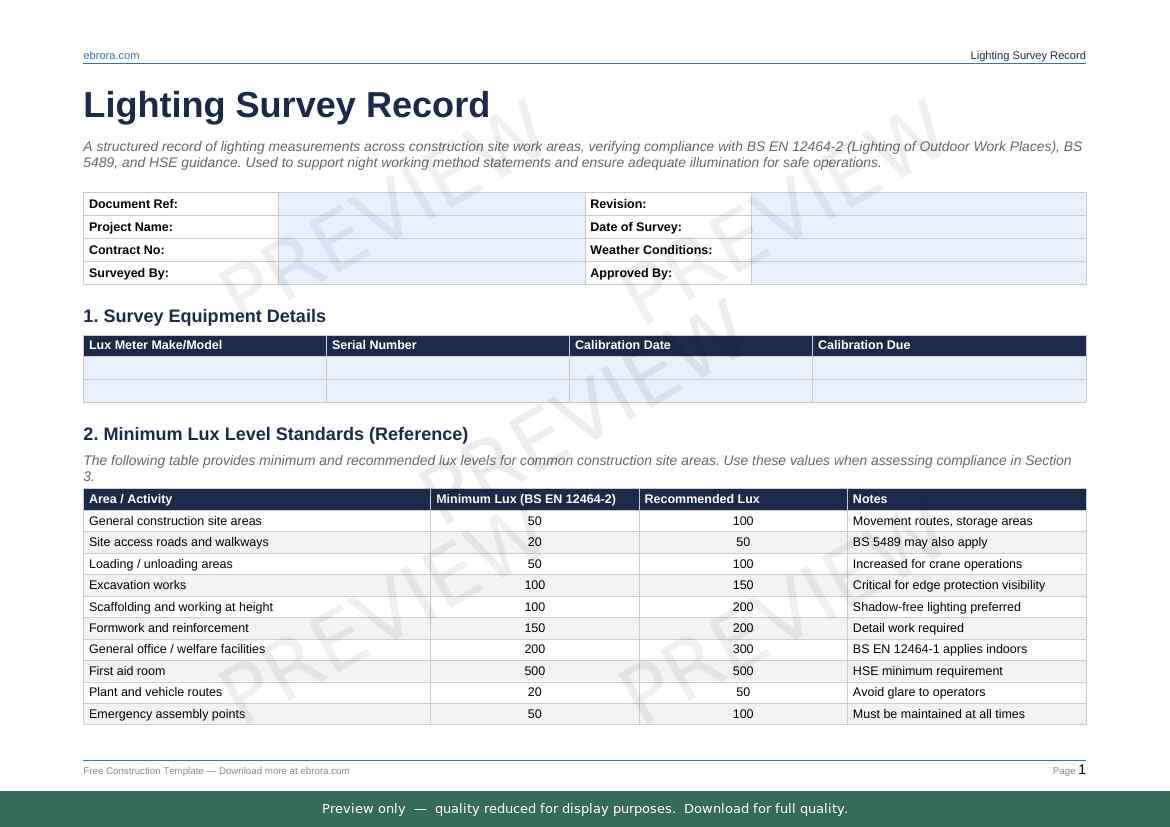 Free Word template: Lighting Survey Record. Download for UK construction sites.