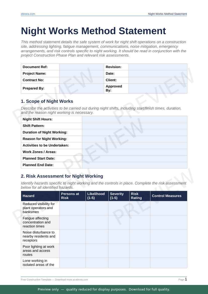 Free Word template: Night Works Method Statement. Download for UK construction sites.