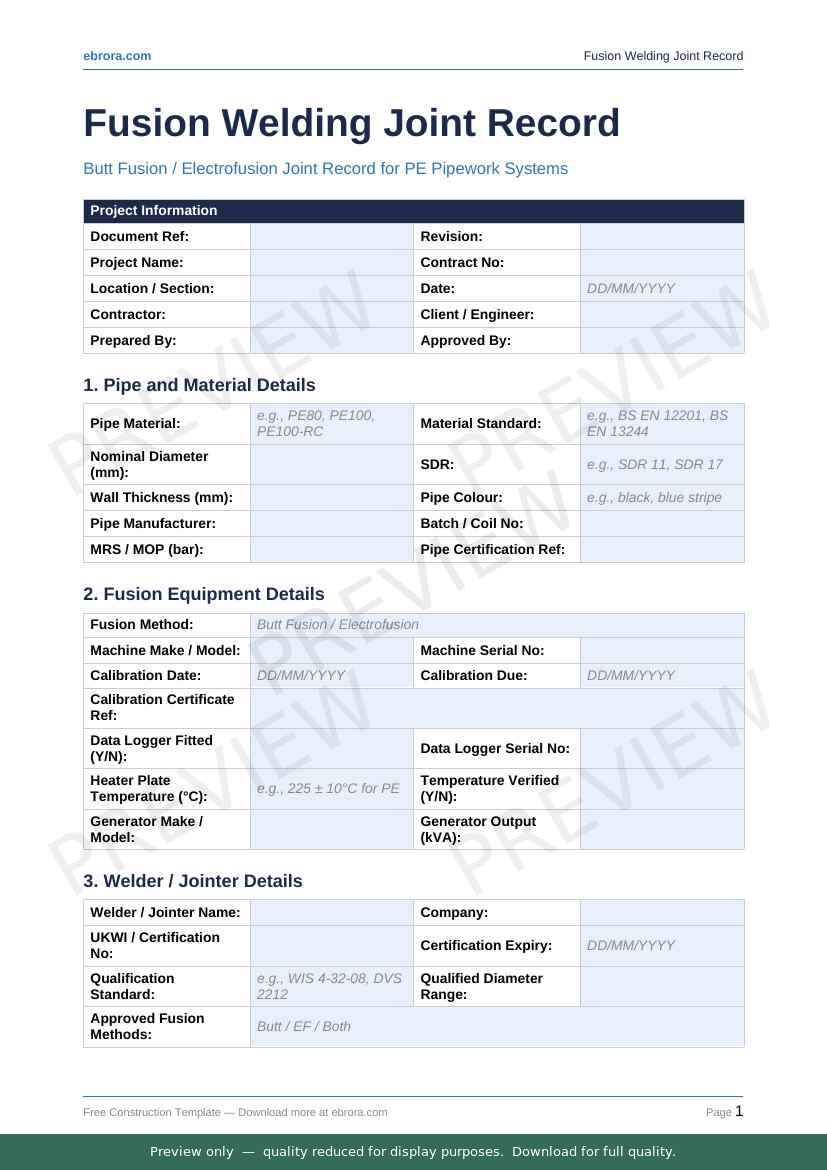 Free Word template: Fusion Welding Joint Record. Download for UK construction sites.