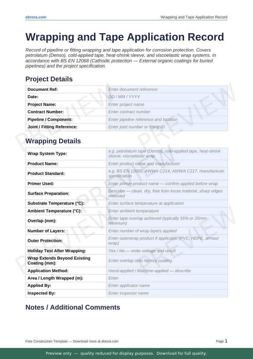 Free Word template: Wrapping and Tape Application Record. Download for UK construction sites.