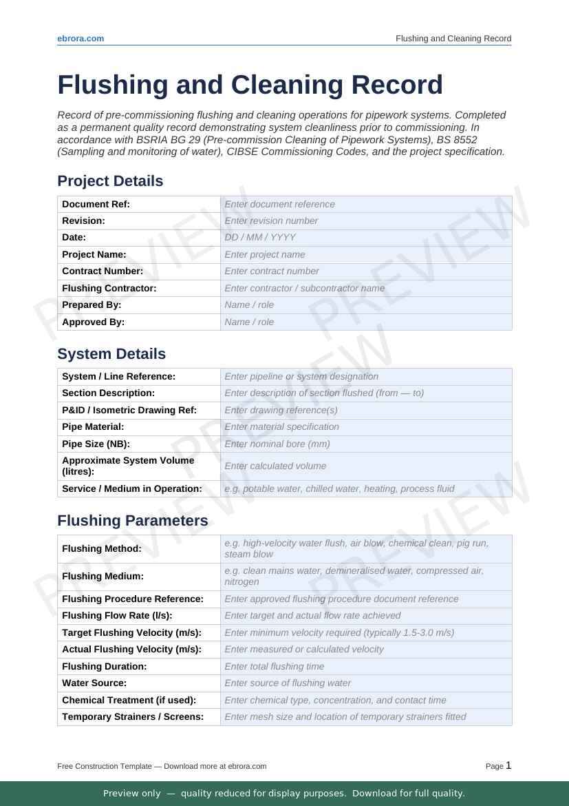Free Word template: Flushing and Cleaning Record. Download for UK construction sites.