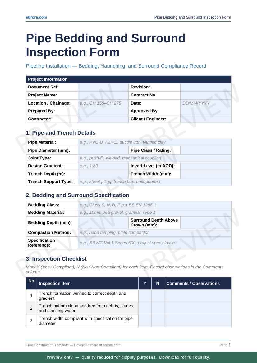 Free Word template: Pipe Bedding and Surround Inspection Form. Download for UK construction sites.