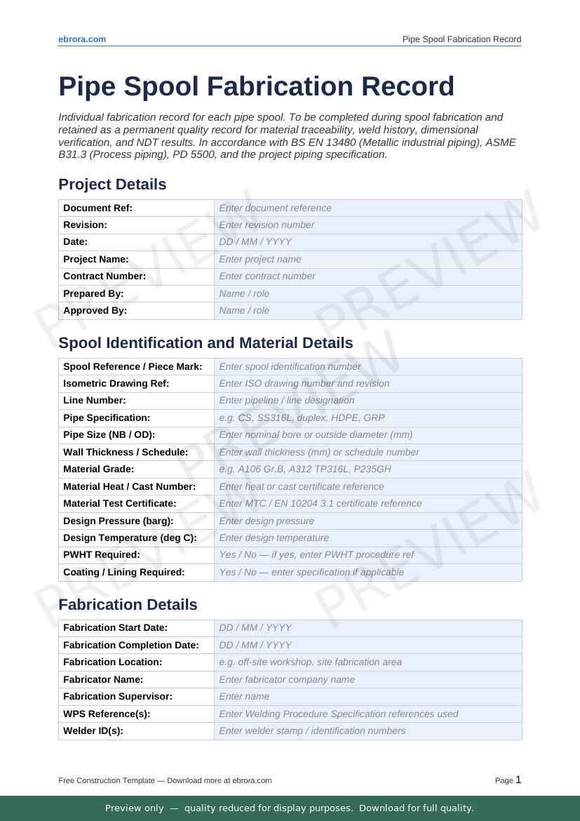 Free Word template: Pipe Spool Fabrication Record. Download for UK construction sites.