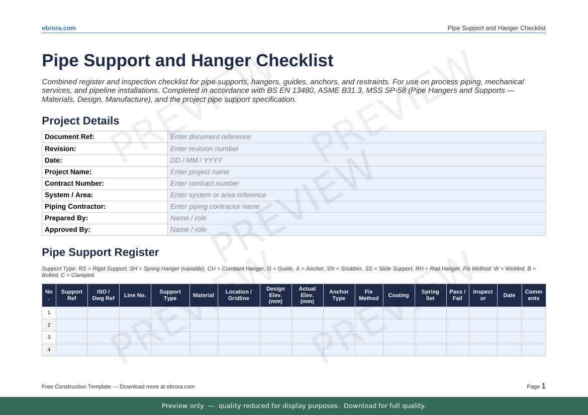 Free Word template: Pipe Support and Hanger Checklist. Download for UK construction sites.