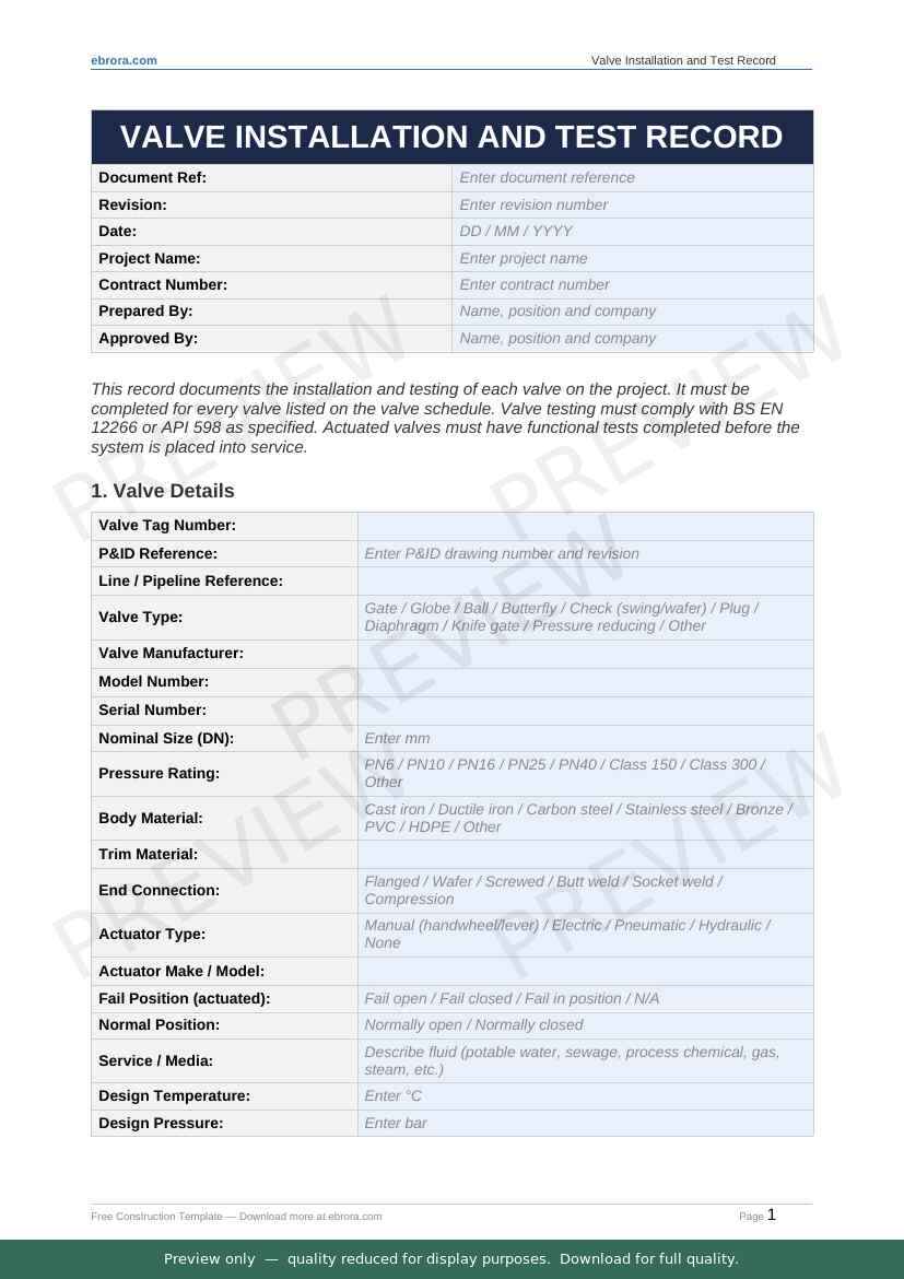 Free Word template: Valve Installation and Test Record. Download for UK construction sites.