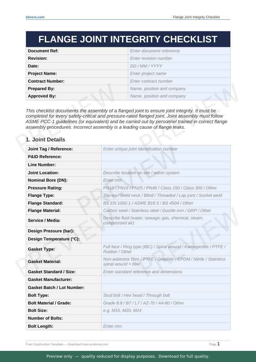 Free Word template: Flange Joint Integrity Checklist. Download for UK construction sites.