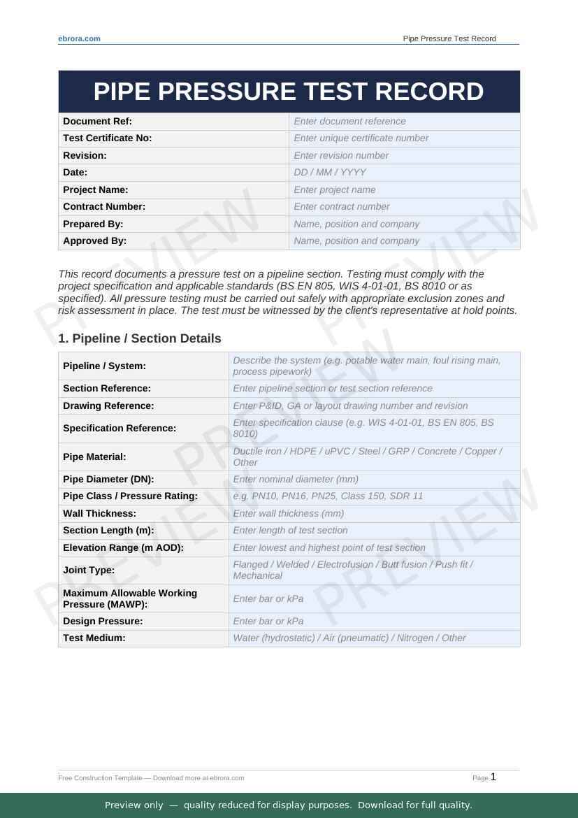 Free Word template: Pipe Pressure Test Record. Download for UK construction sites.