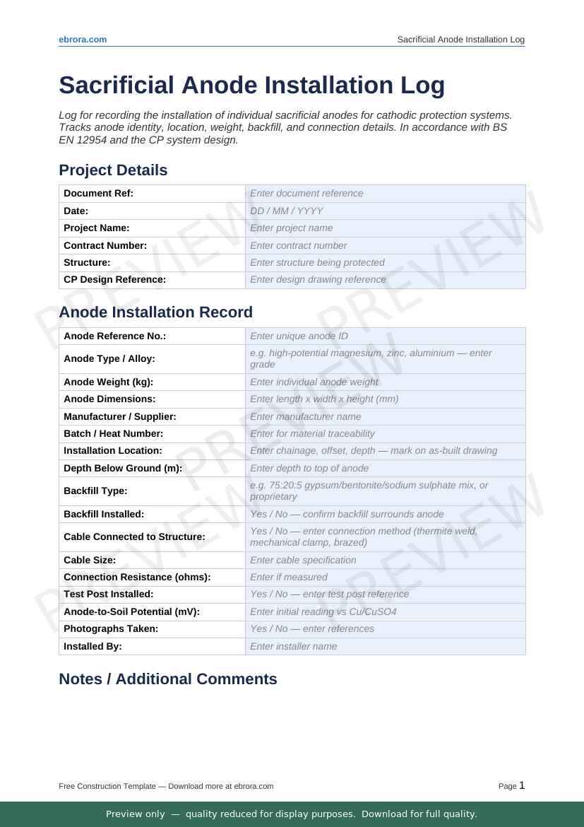 Free Word template: Sacrificial Anode Installation Log. Download for UK construction sites.