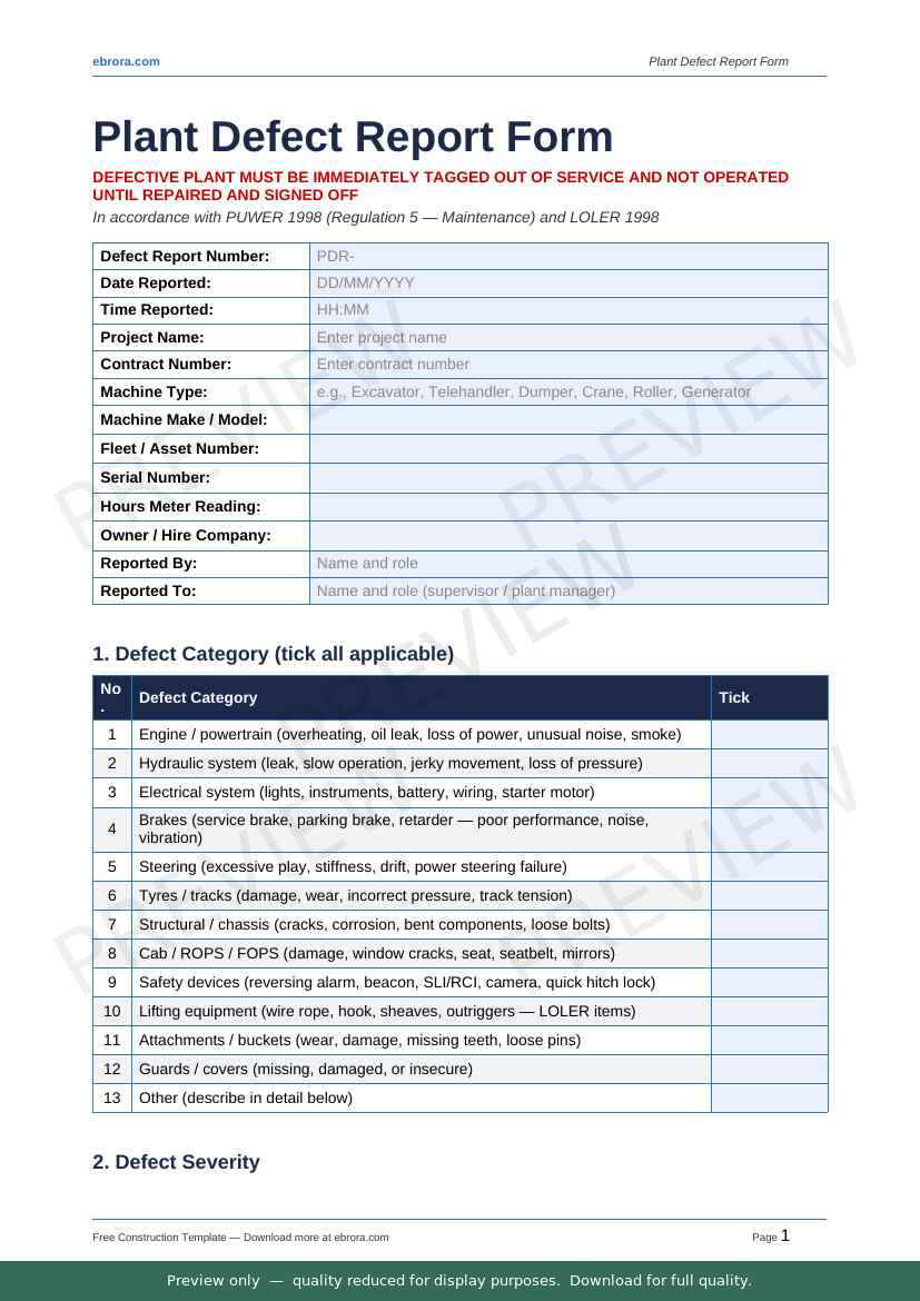 Free Word template: Plant Defect Report Form. Download for UK construction sites.