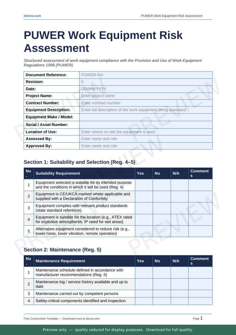 Free Word template: Puwer Work Equipment Risk Assessment. Download for UK construction sites.