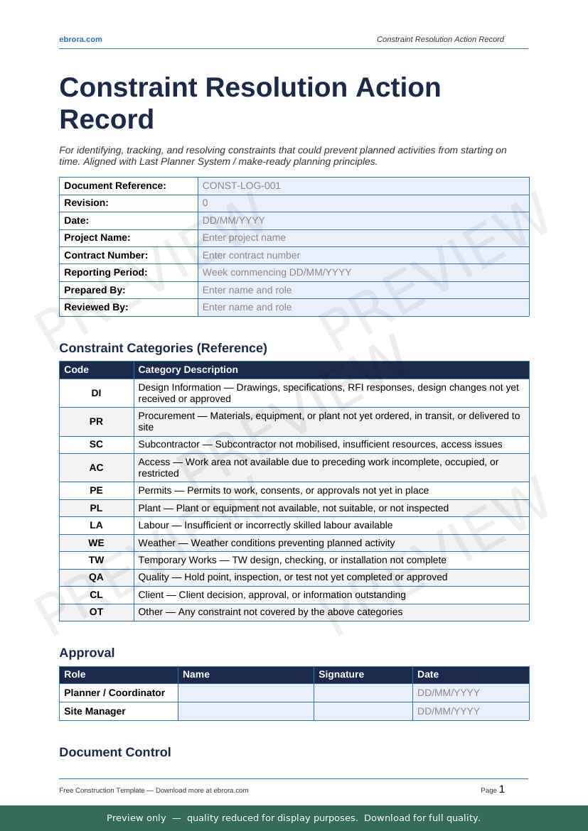 Free Word template: Constraint Resolution Action Record. Download for UK construction sites.