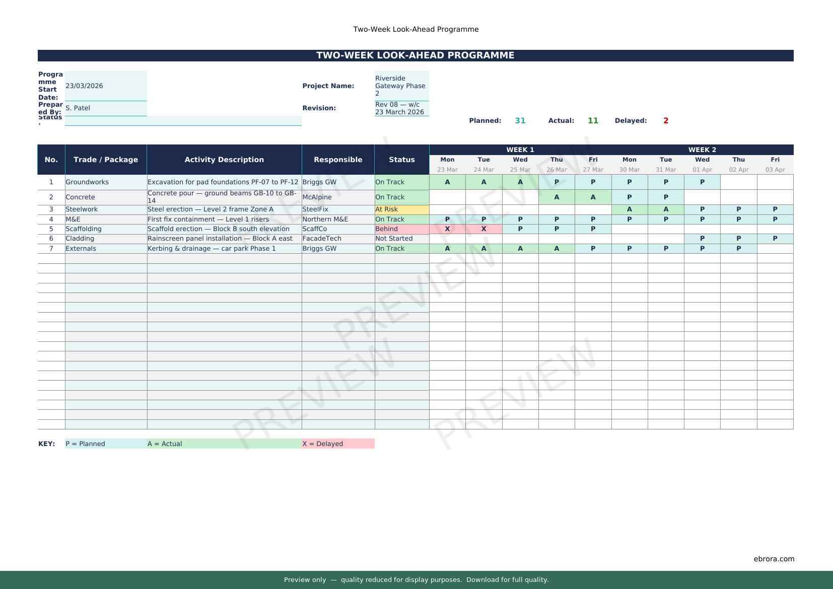 Free Excel template: Two Week Look Ahead Programme. Download for UK construction sites.