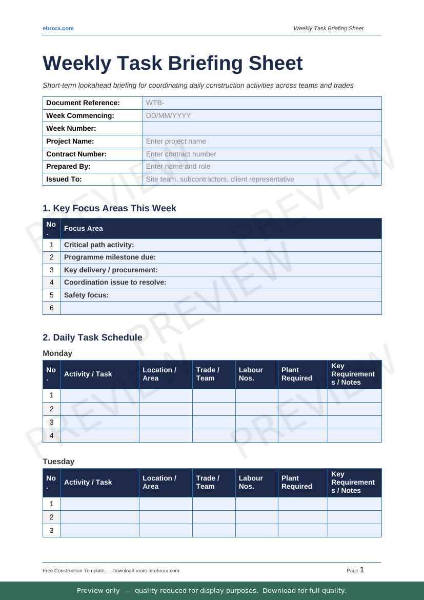 Free Word template: Weekly Task Briefing Sheet. Download for UK construction sites.