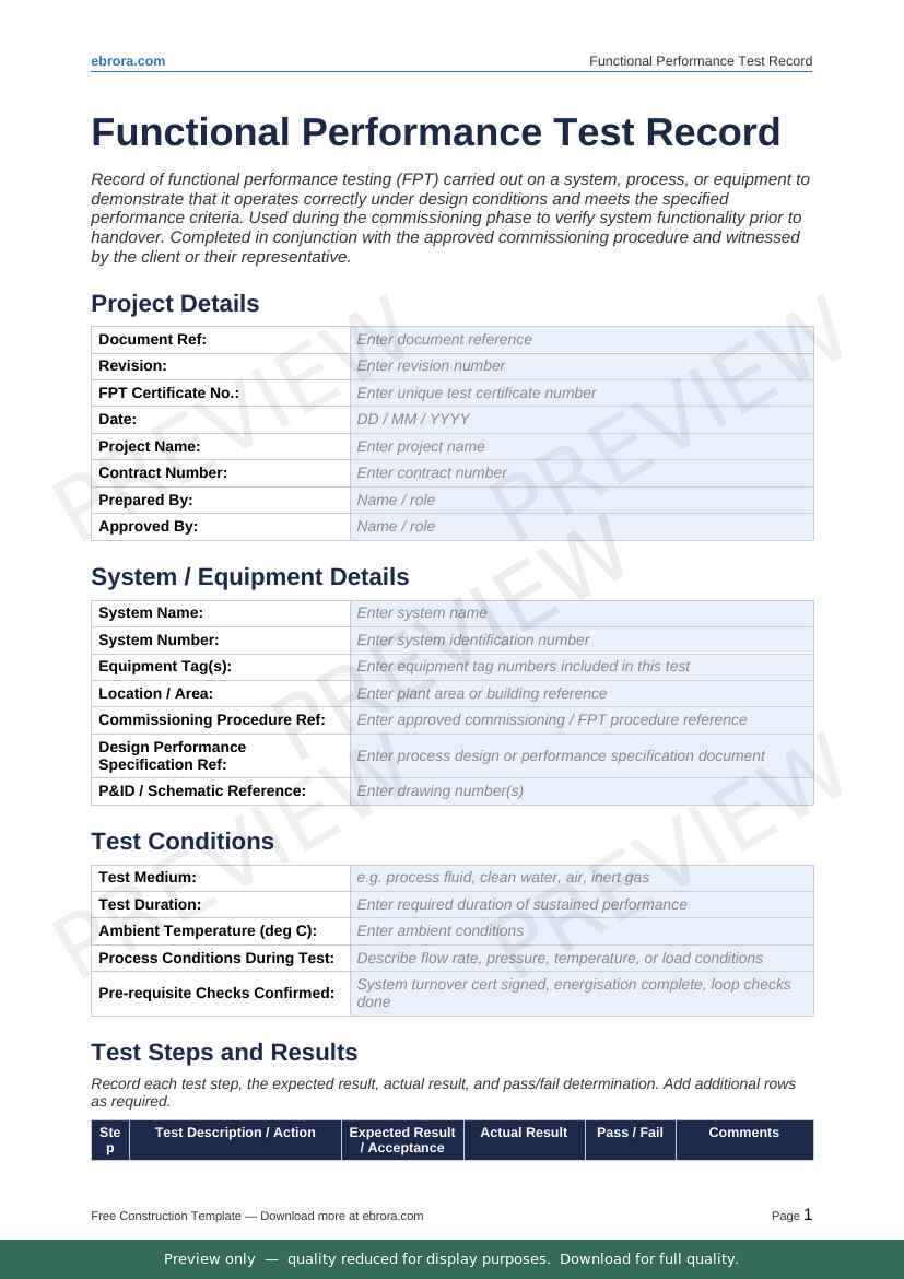 Free Word template: Functional Performance Test Record. Download for UK construction sites.