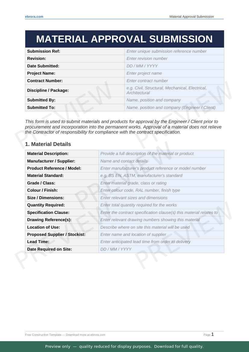 Free Word template: Material Approval Submission. Download for UK construction sites.