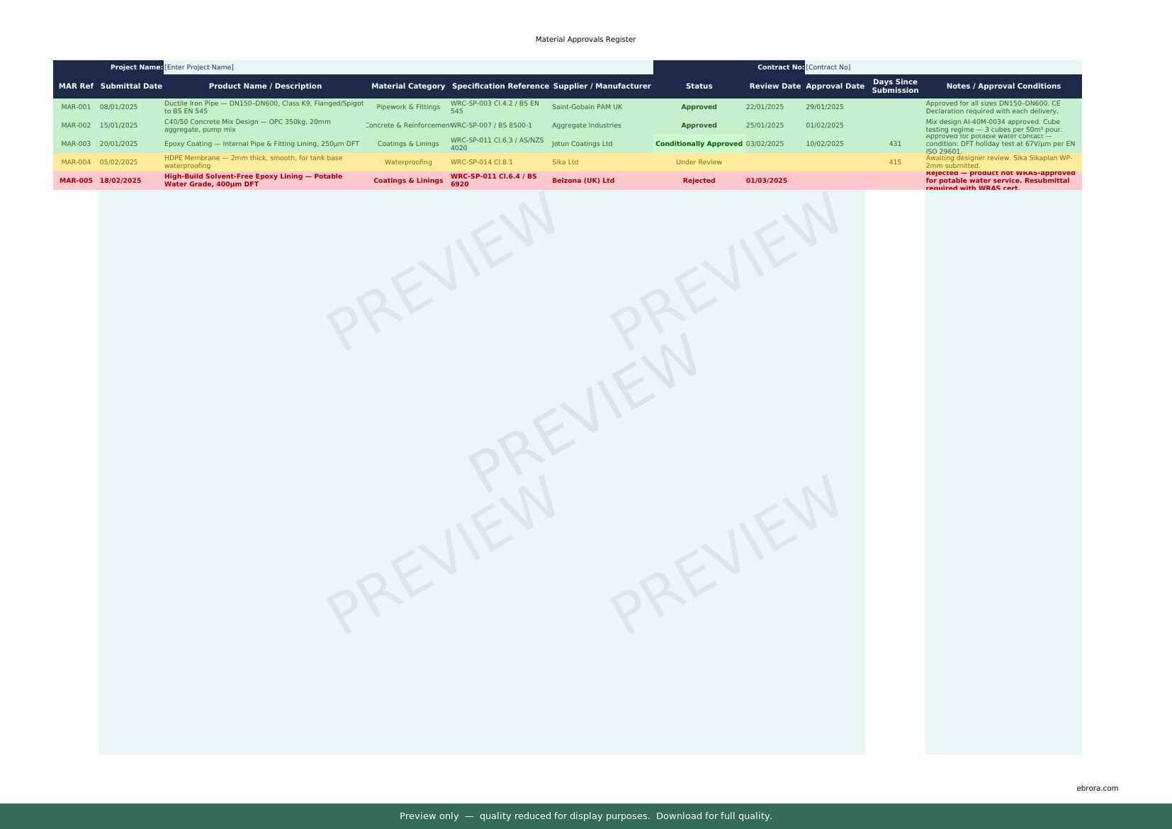 Free Excel template: Material Approvals Register. Download for UK construction sites.