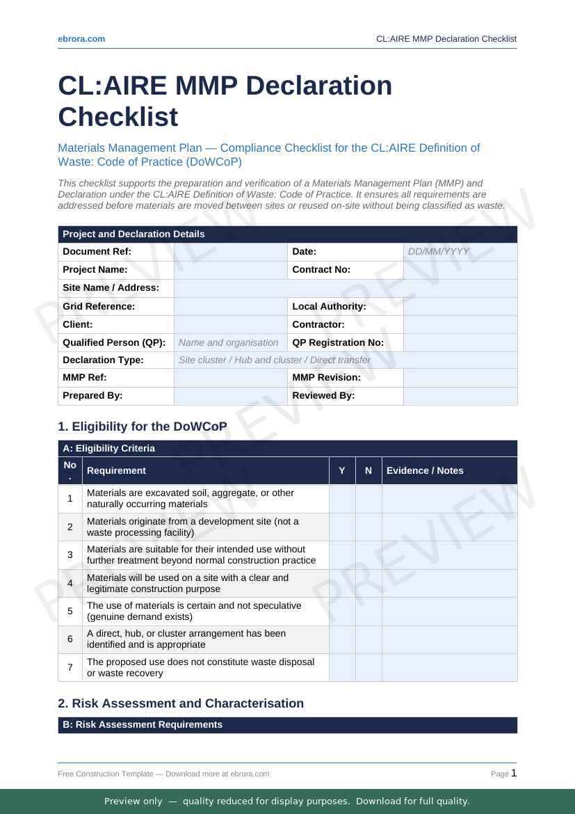 Free Word template: Claire Mmp Declaration Checklist. Download for UK construction sites.