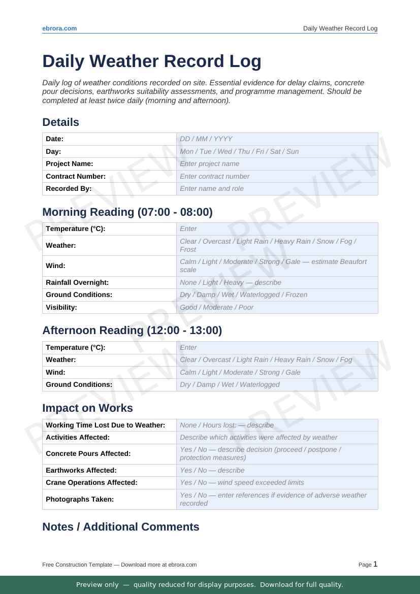 Free Word template: Daily Weather Record Log. Download for UK construction sites.