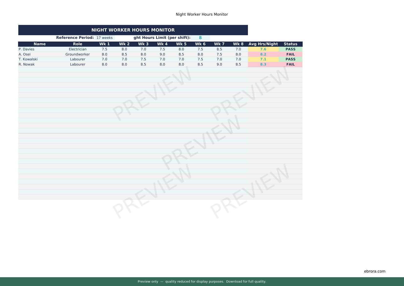 Free Excel template: Night Worker Hours Monitor. Download for UK construction sites.