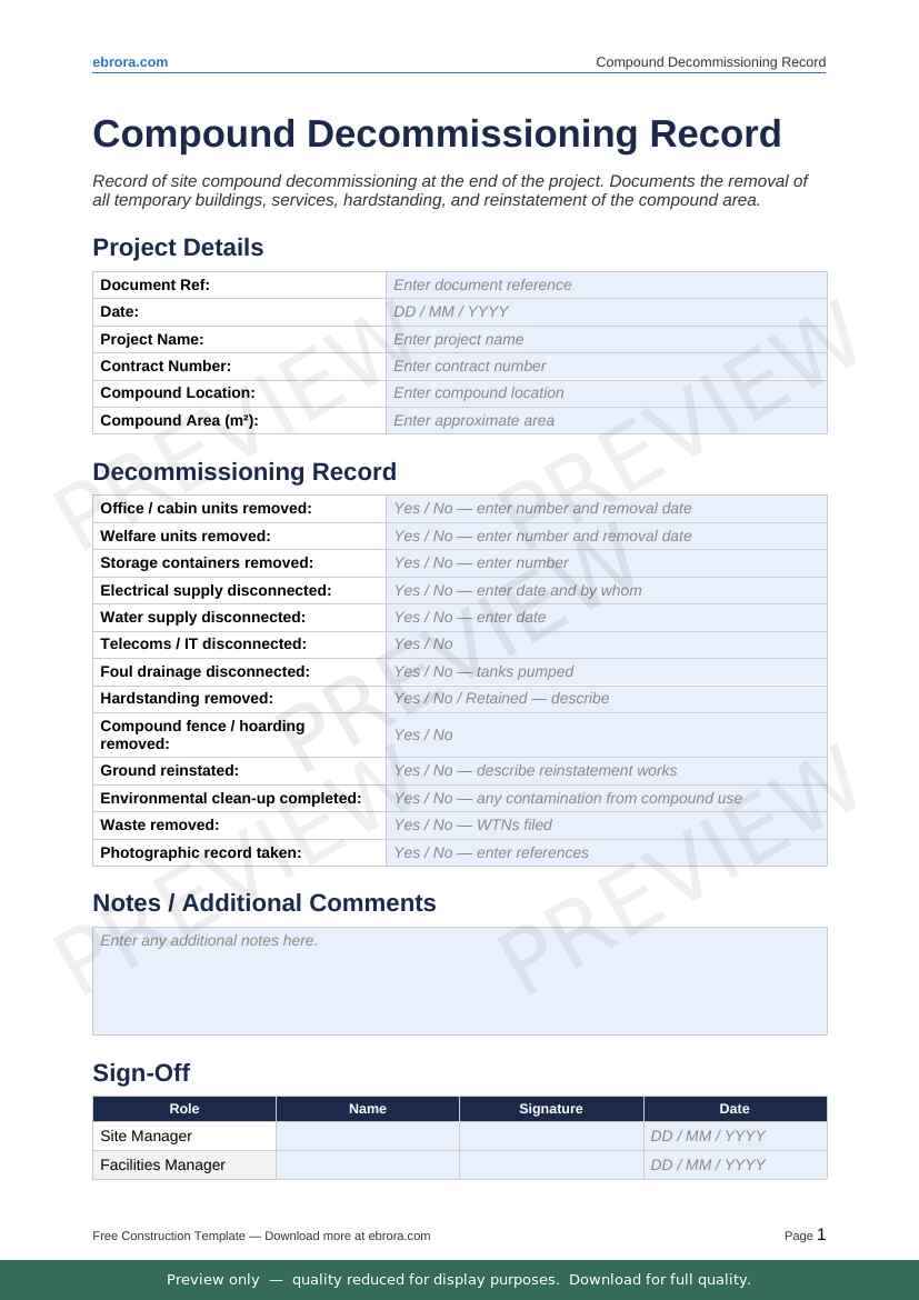 Free Word template: Compound Decommissioning Record. Download for UK construction sites.