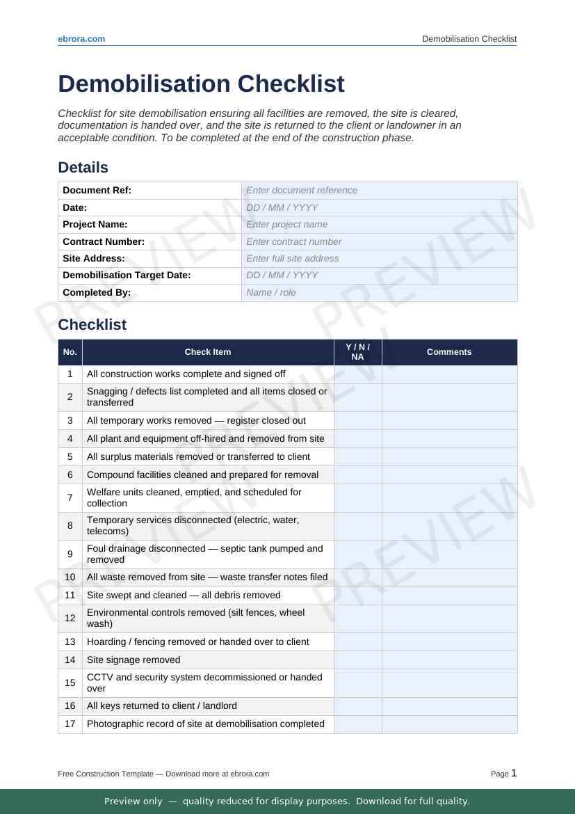 Free Word template: Demobilisation Checklist. Download for UK construction sites.