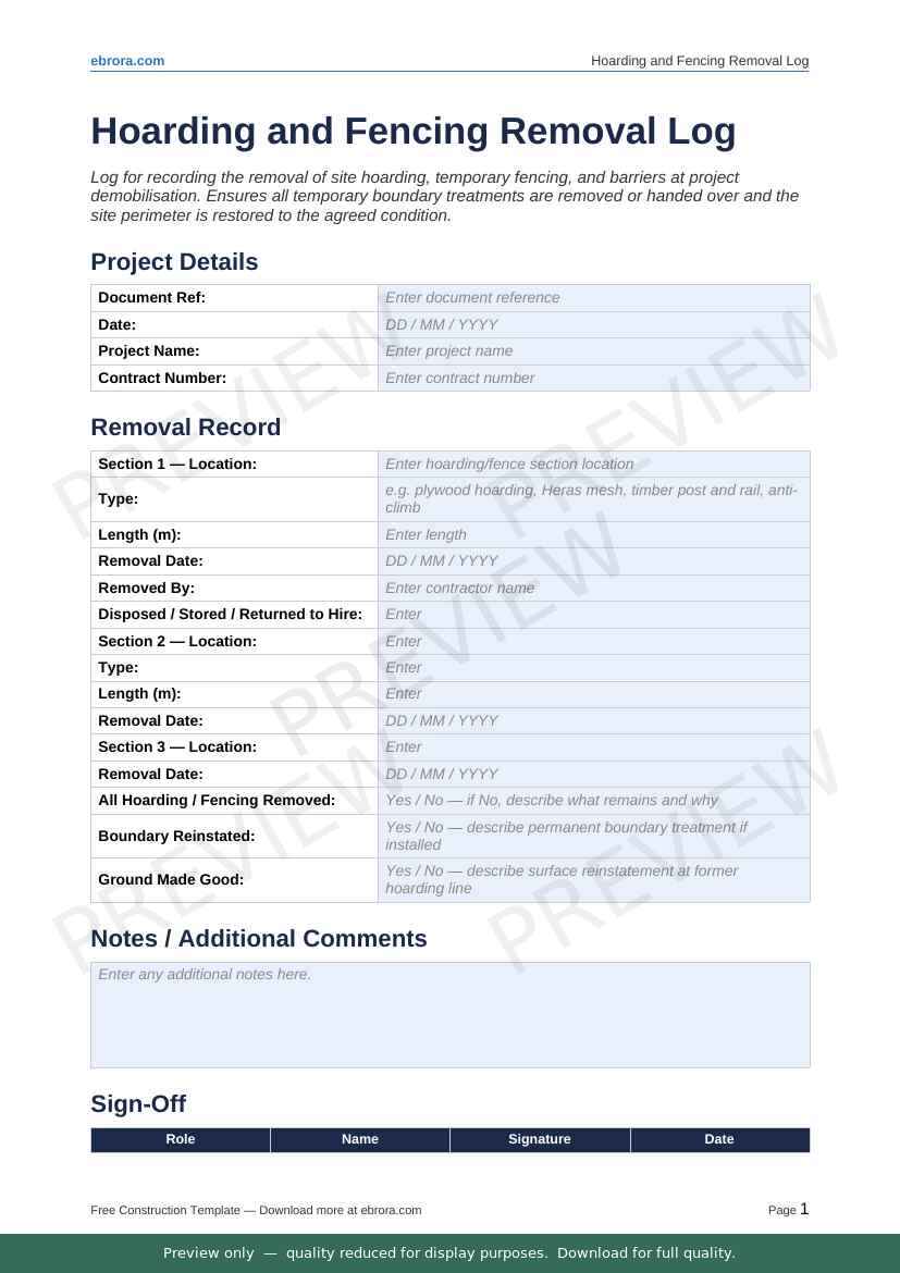 Free Word template: Hoarding and Fencing Removal Log. Download for UK construction sites.