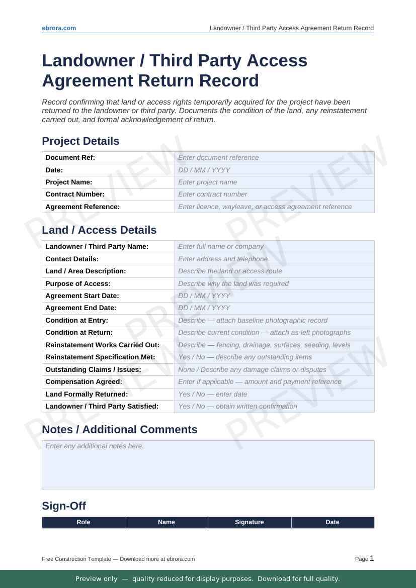 Free Word template: Landowner Third Party Access Agreement Return Record. Download for UK construction sites.