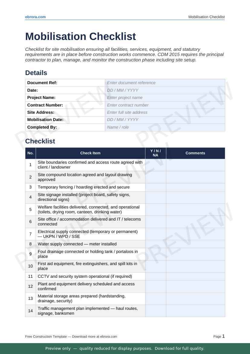 Free Word template: Mobilisation Checklist. Download for UK construction sites.