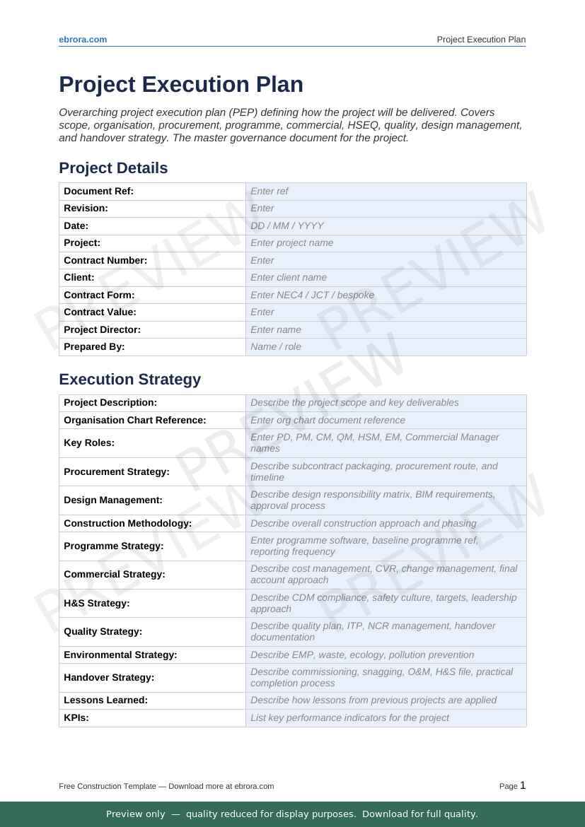 Free Word template: Project Execution Plan. Download for UK construction sites.