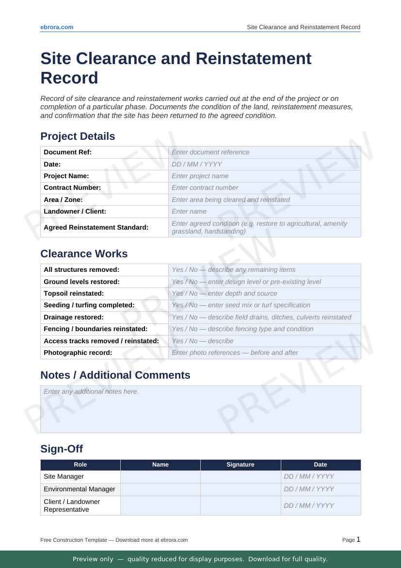 Free Word template: Site Clearance and Reinstatement Record. Download for UK construction sites.