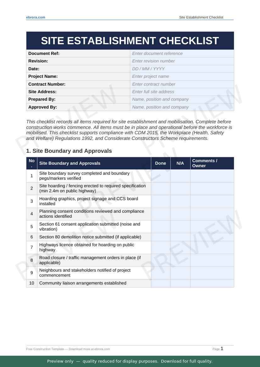 Free Word template: Site Establishment Checklist. Download for UK construction sites.