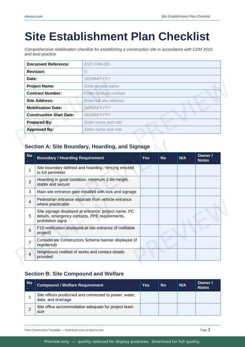 Free Word template: Site Establishment Plan Checklist. Download for UK construction sites.