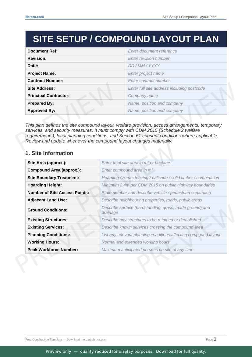 Free Word template: Site Setup Compound Layout Plan. Download for UK construction sites.