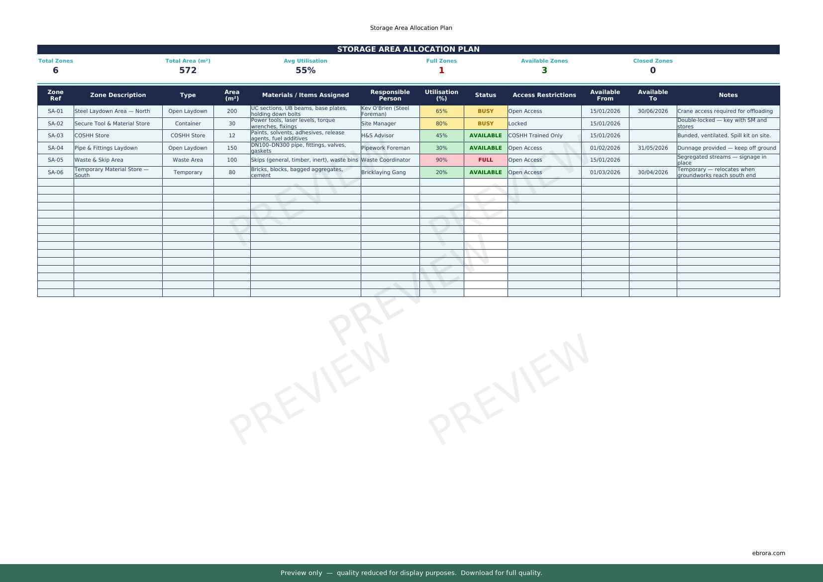Free Excel template: Storage Area Allocation Plan. Download for UK construction sites.