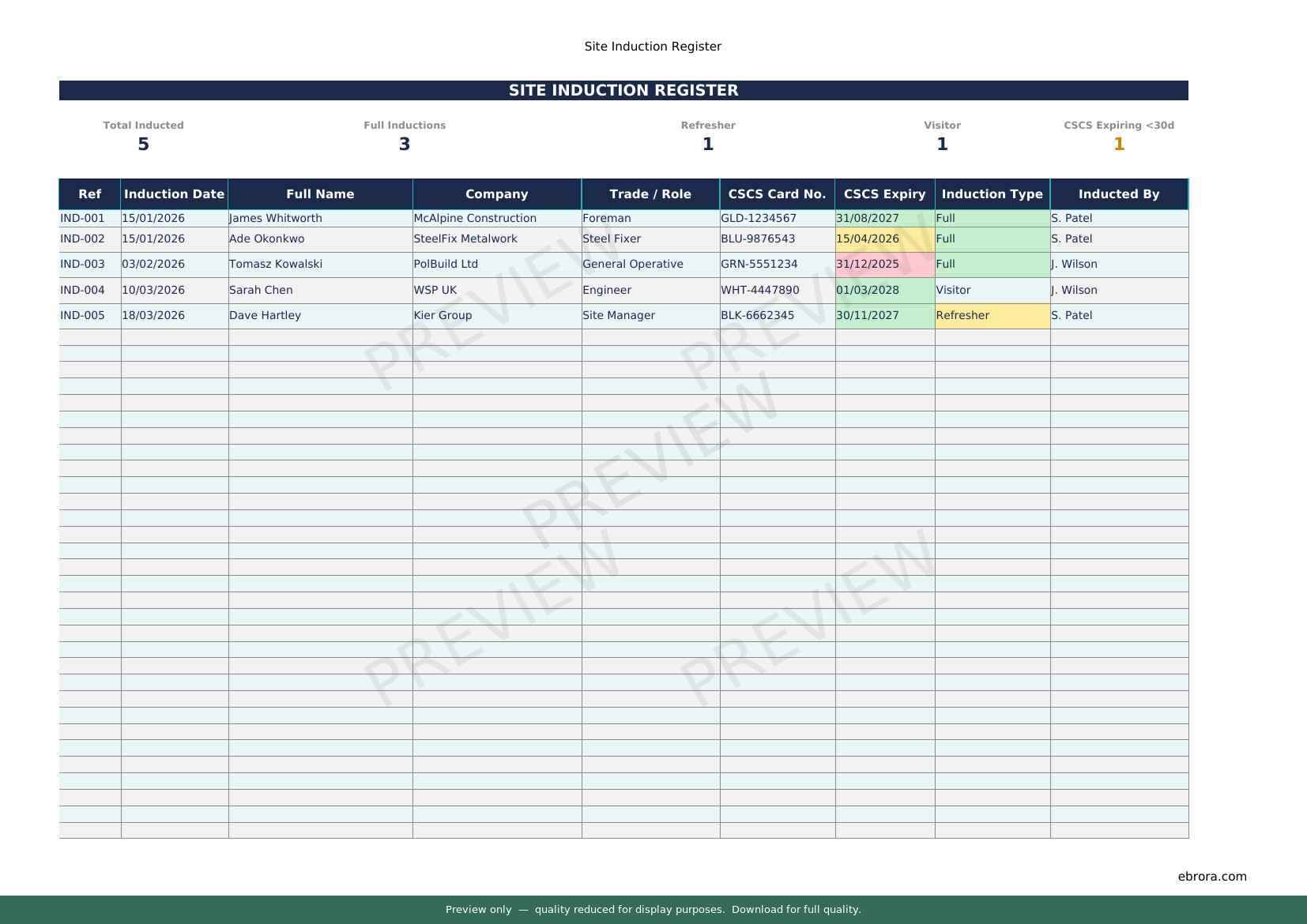 Free Excel template: Site Induction Register. Download for UK construction sites.