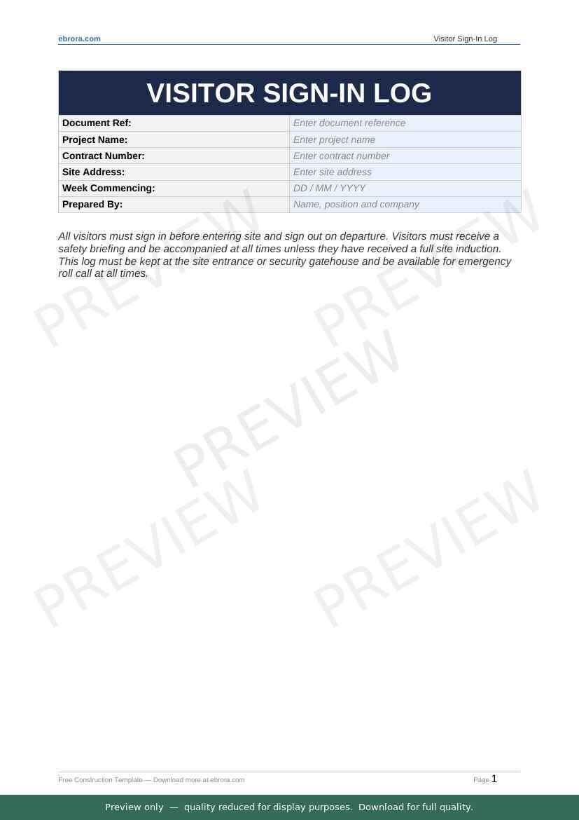 Free Word template: Visitor Sign in Log. Download for UK construction sites.