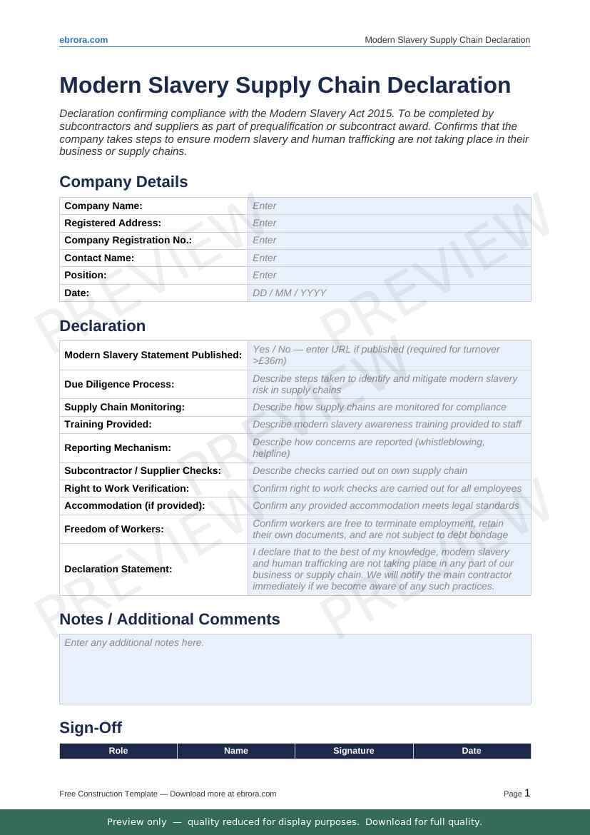 Free Word template: Modern Slavery Supply Chain Declaration. Download for UK construction sites.