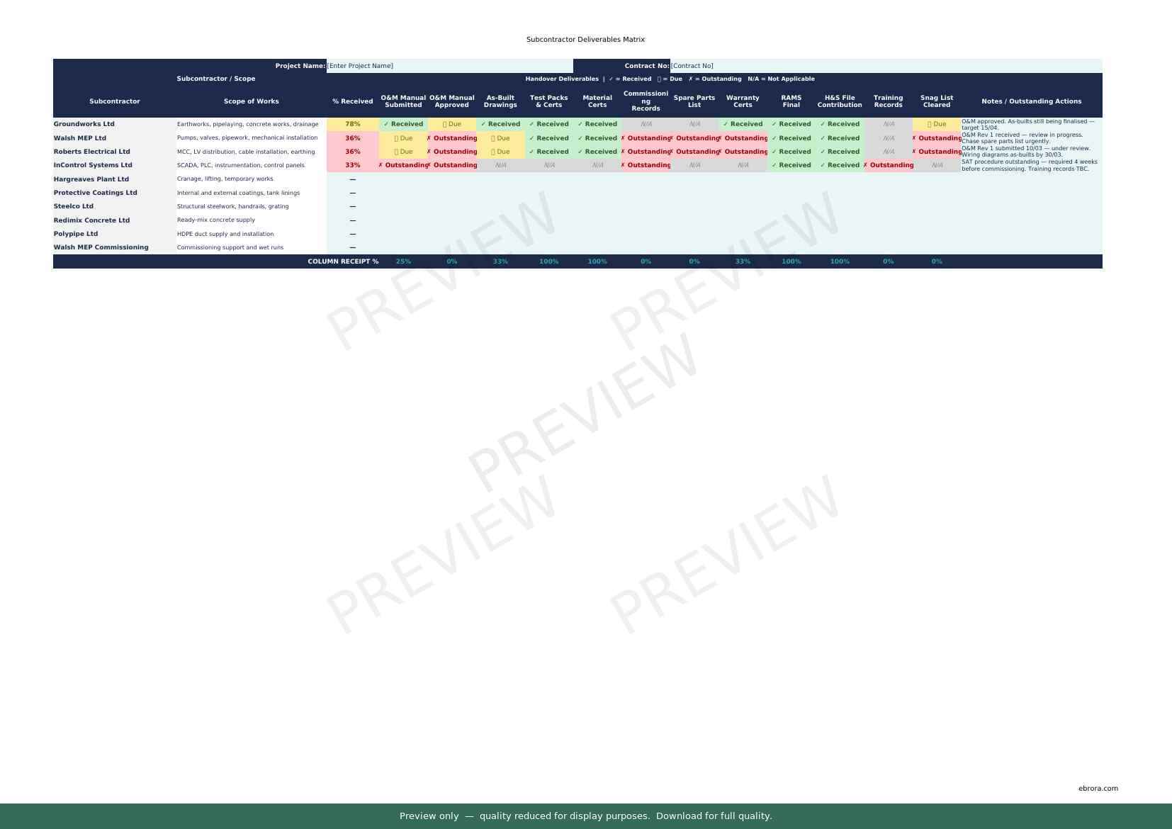 Free Excel template: Subcontractor Deliverables Matrix. Download for UK construction sites.