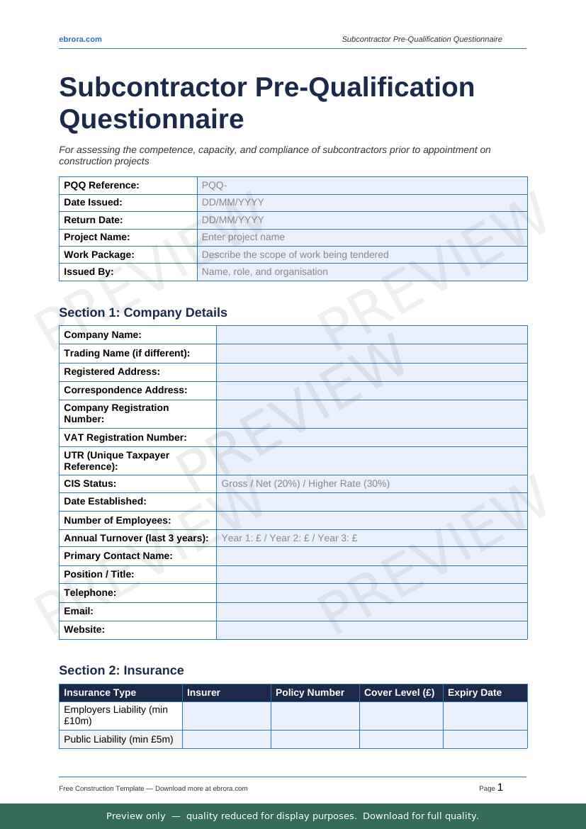 Free Word template: Subcontractor Pre Qualification Questionnaire. Download for UK construction sites.