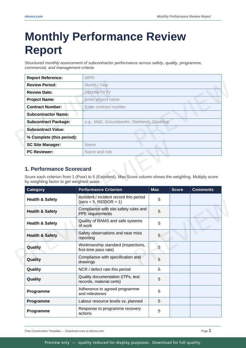 Free Word template: Monthly Performance Review Report. Download for UK construction sites.