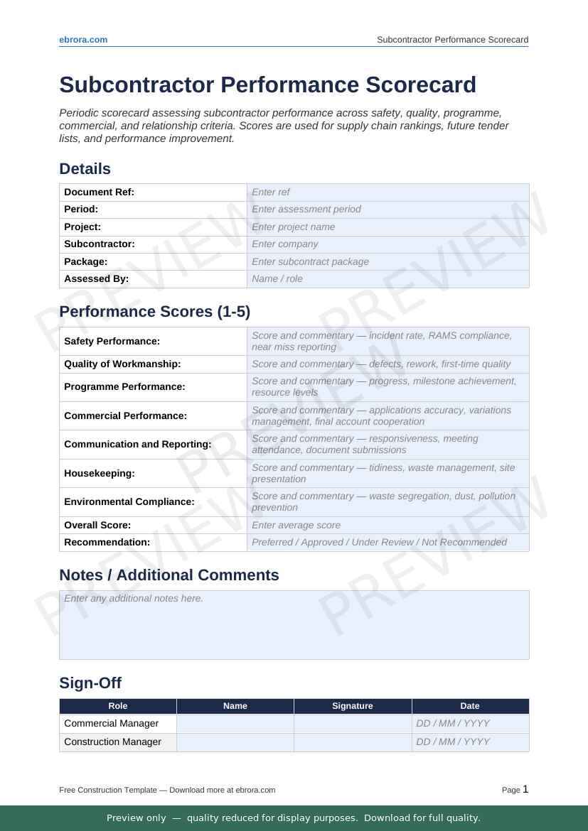 Free Word template: Subcontractor Performance Scorecard. Download for UK construction sites.