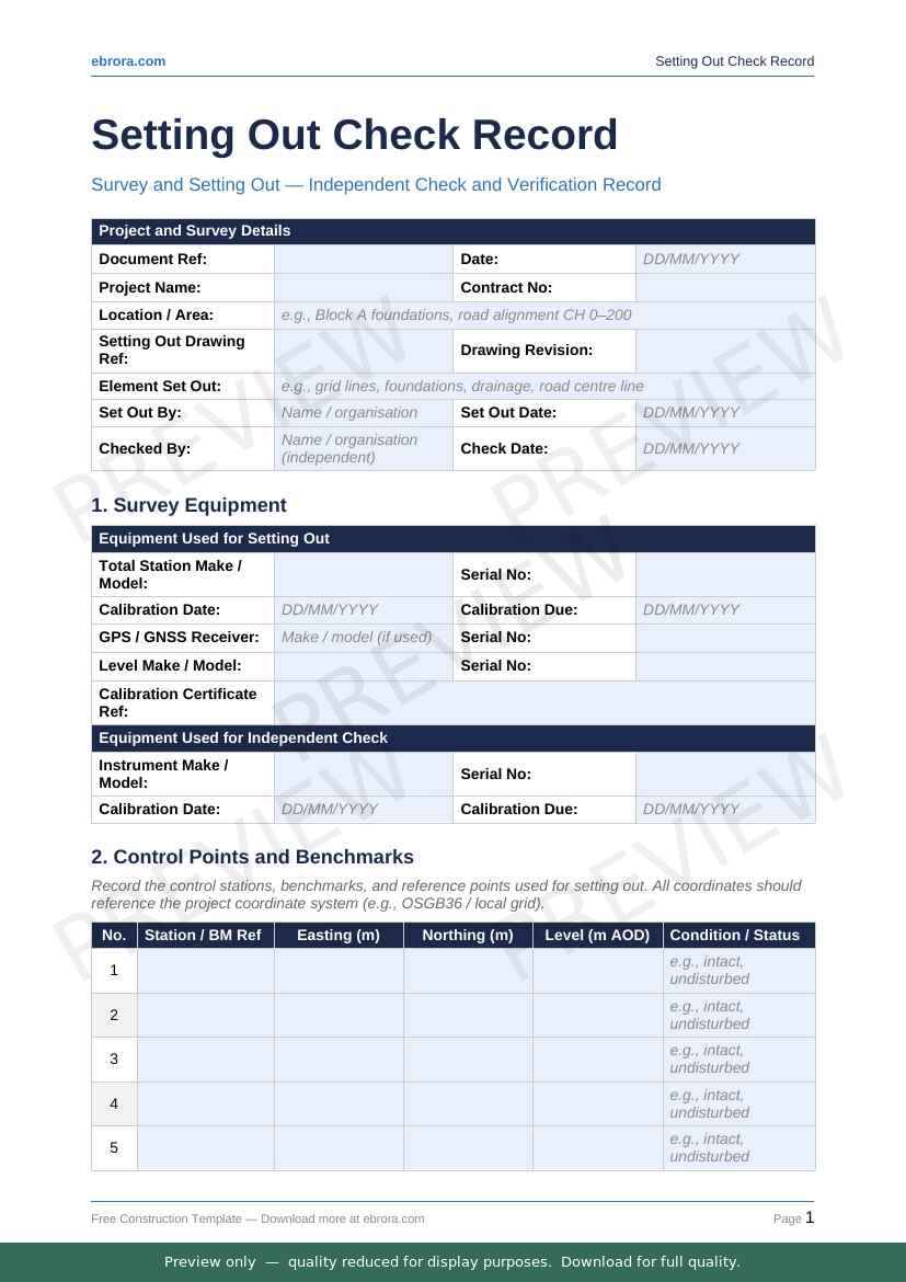 Free Word template: Setting Out Check Record. Download for UK construction sites.