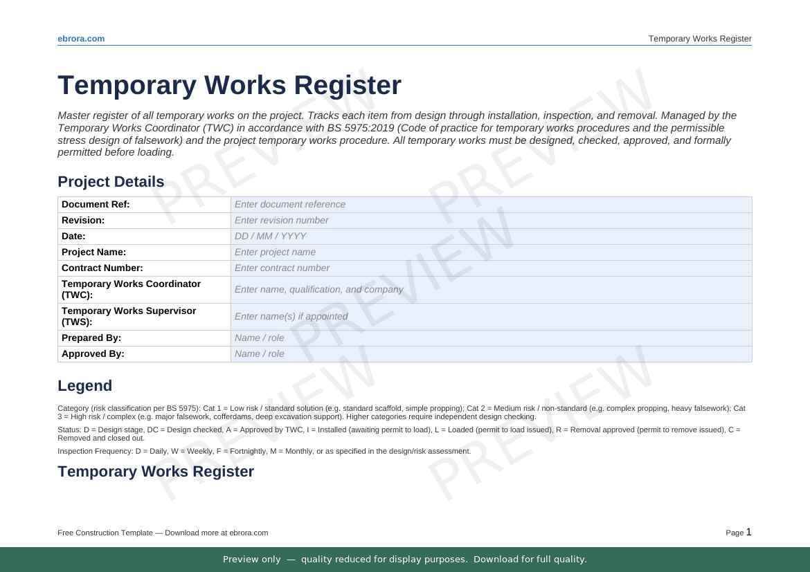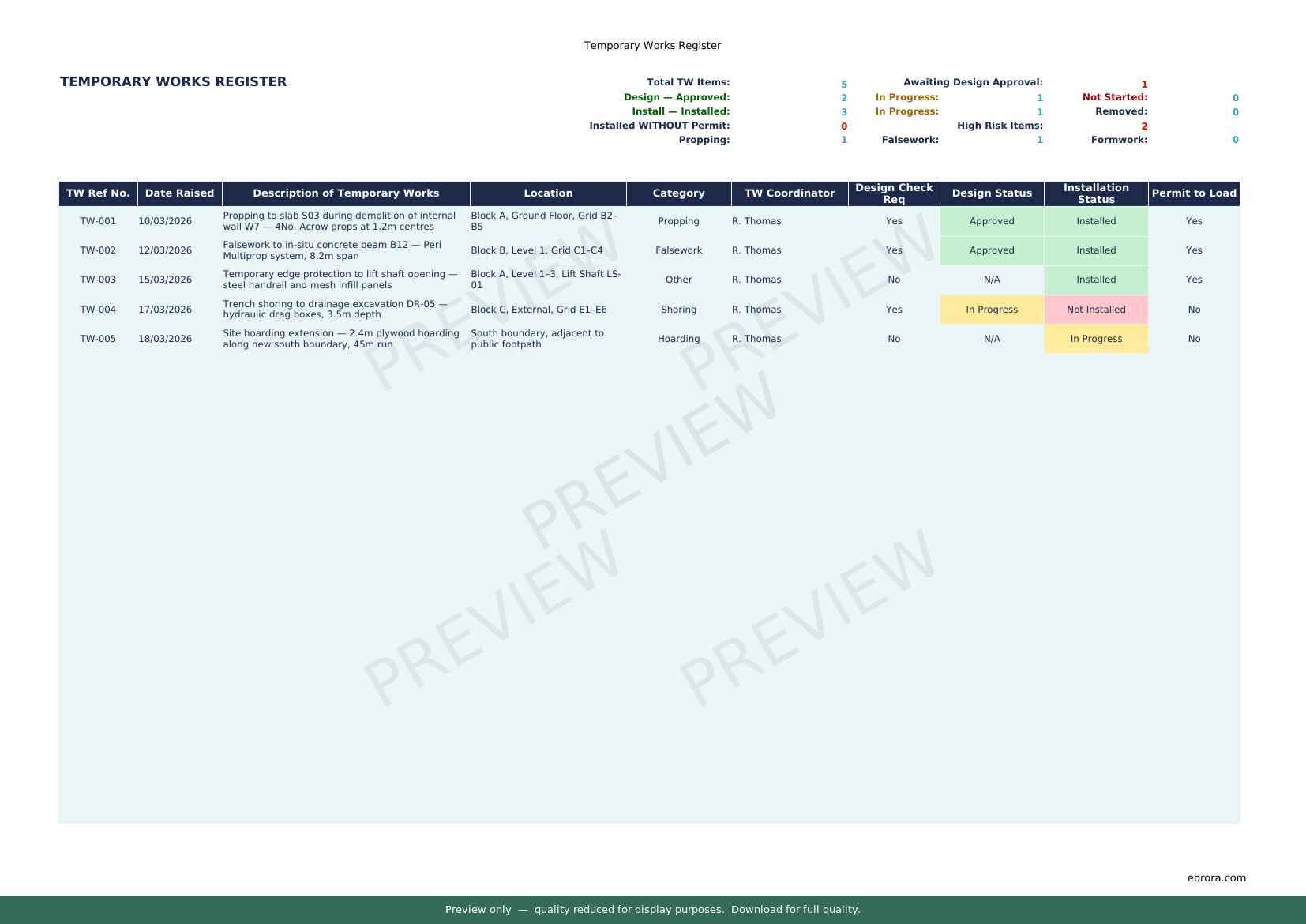 Free Excel template: Temporary Works Register. Download for UK construction sites.