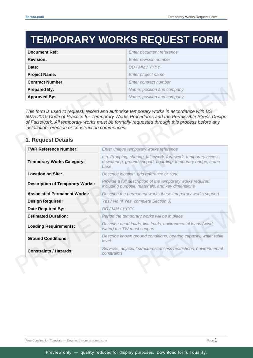 Free Word template: Temporary Works Request Form. Download for UK construction sites.