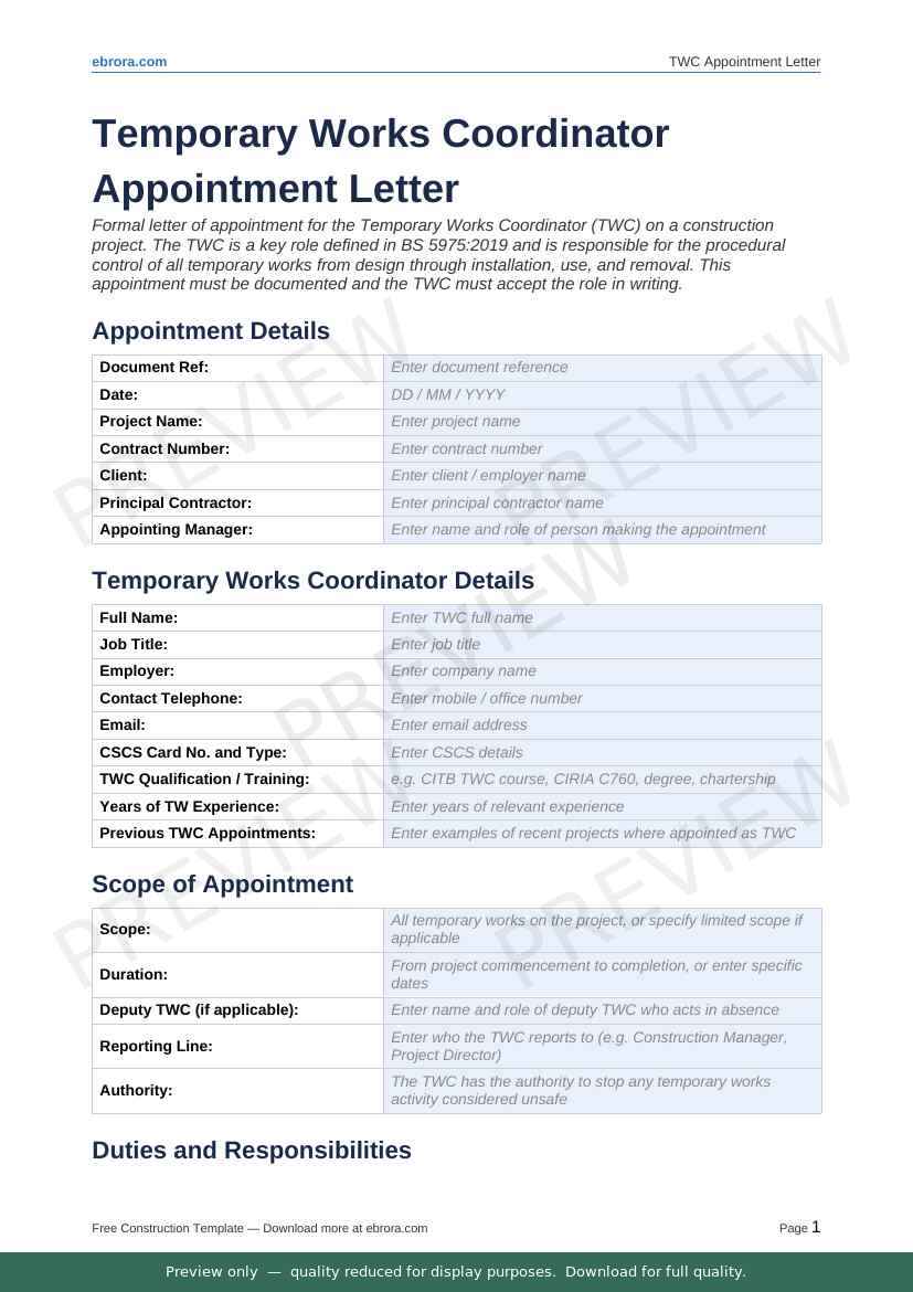 Free Word template: Temporary Works Coordinator Appointment Letter. Download for UK construction sites.